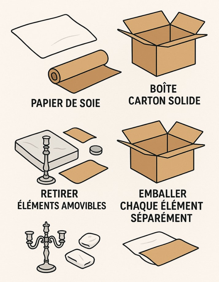 - Emballer chaque pièce séparément, en utilisant du papier de soie/journal puis du papier bulles /kraft pour une protection optimale.