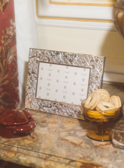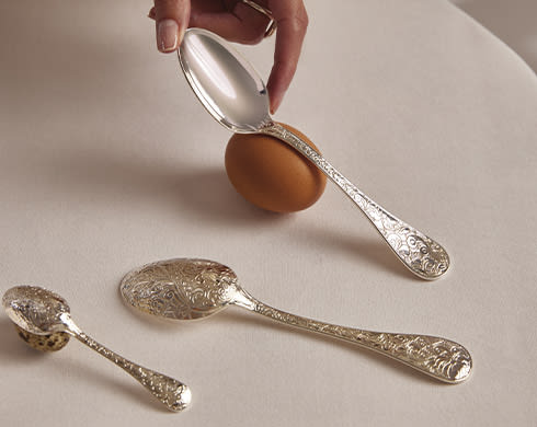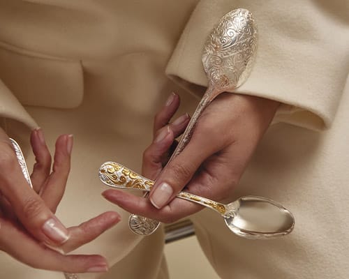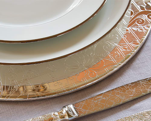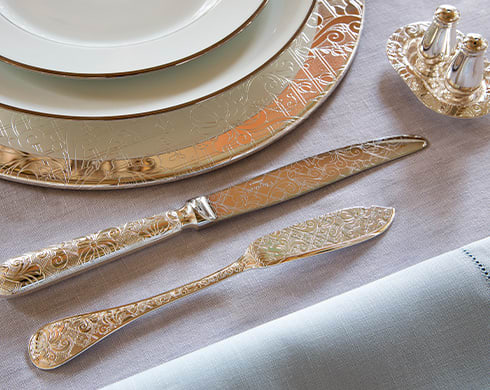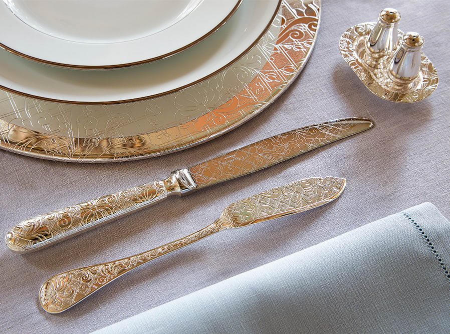 Un ensemble de couverts précieux et raffinés, proposé également en dorure partielle, où le mélange des deux ors met encore plus en lumière la profondeur et le détail du motif.