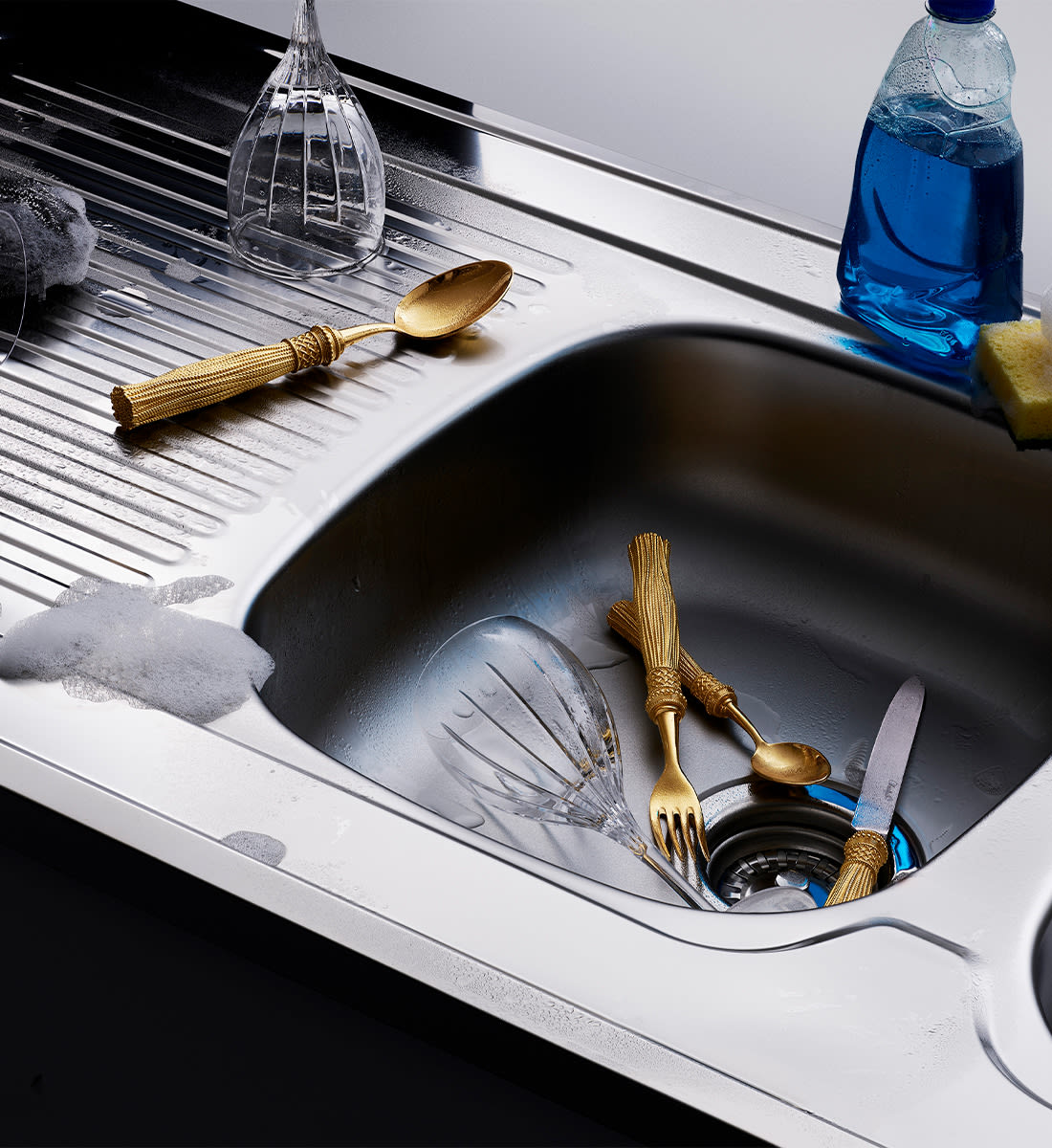 Four cutlery items with "pompom" trompe-l'oeil sculpted handles are available: a table knife, a table fork, a table spoon and a teaspoon. They come plated in silver or gold.