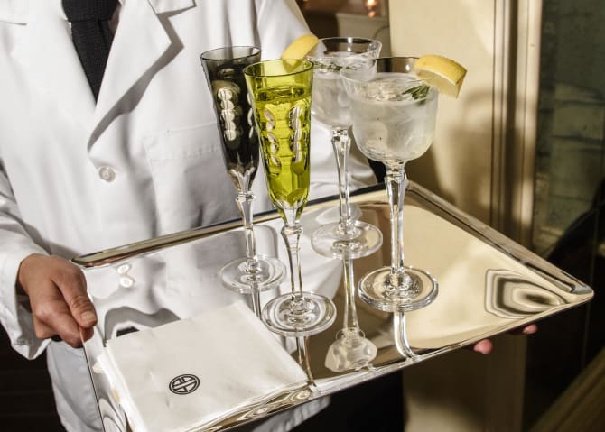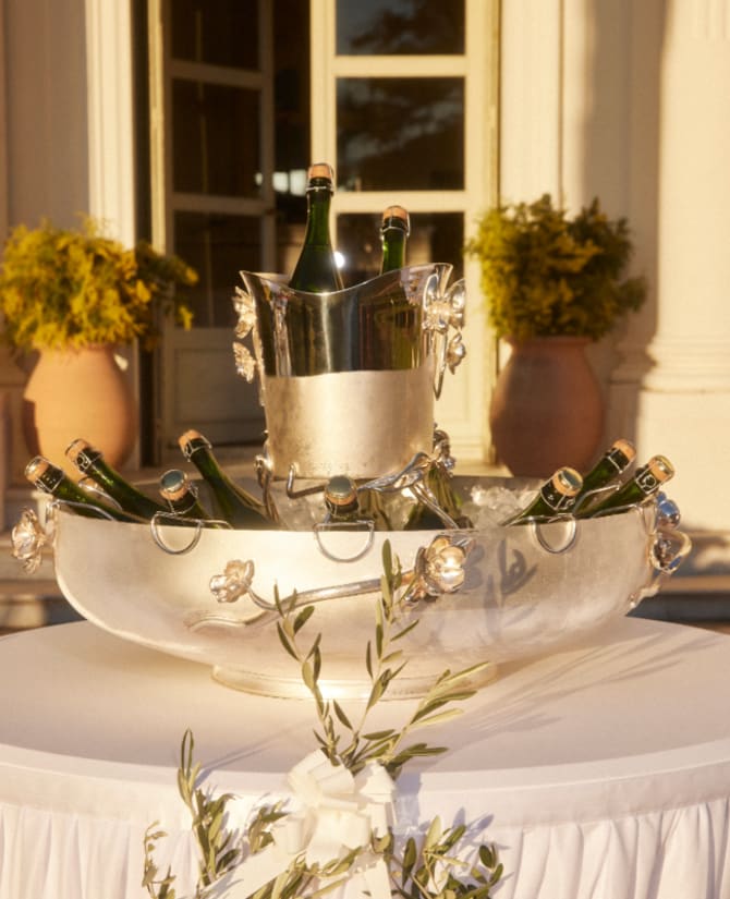 The DELLIPSE collection consists of three exclusive pieces including a Champagne Vasque, a Champagne Bucket, and a Champagne Saber, the ultimate joyful object used to open a bottle of champagne. These exceptional pieces are a revered collaboration between the Maison Christofle and Elliott Barnes.