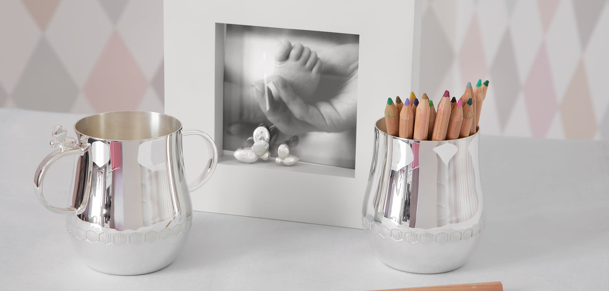 Baby cups, napkin rings and silver metal baby cutlery, picture frames and gift boxes, a complete collection of products for children.