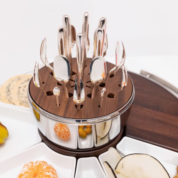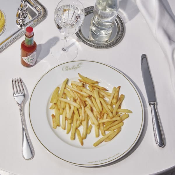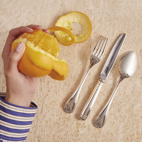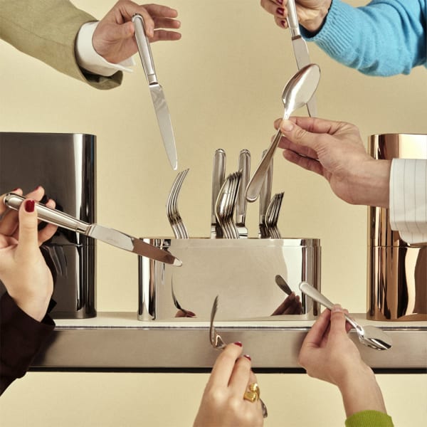 Pompon cutlery are offered by Christofle in silver-plated or gilded. The handles of this cutlery replicate the twisted aspect of the threads making up the pompom, reproducing the idea of the fluid movement of the threads of the passementerie. The entangled threads thus follow curved, irregular, undulating lines.