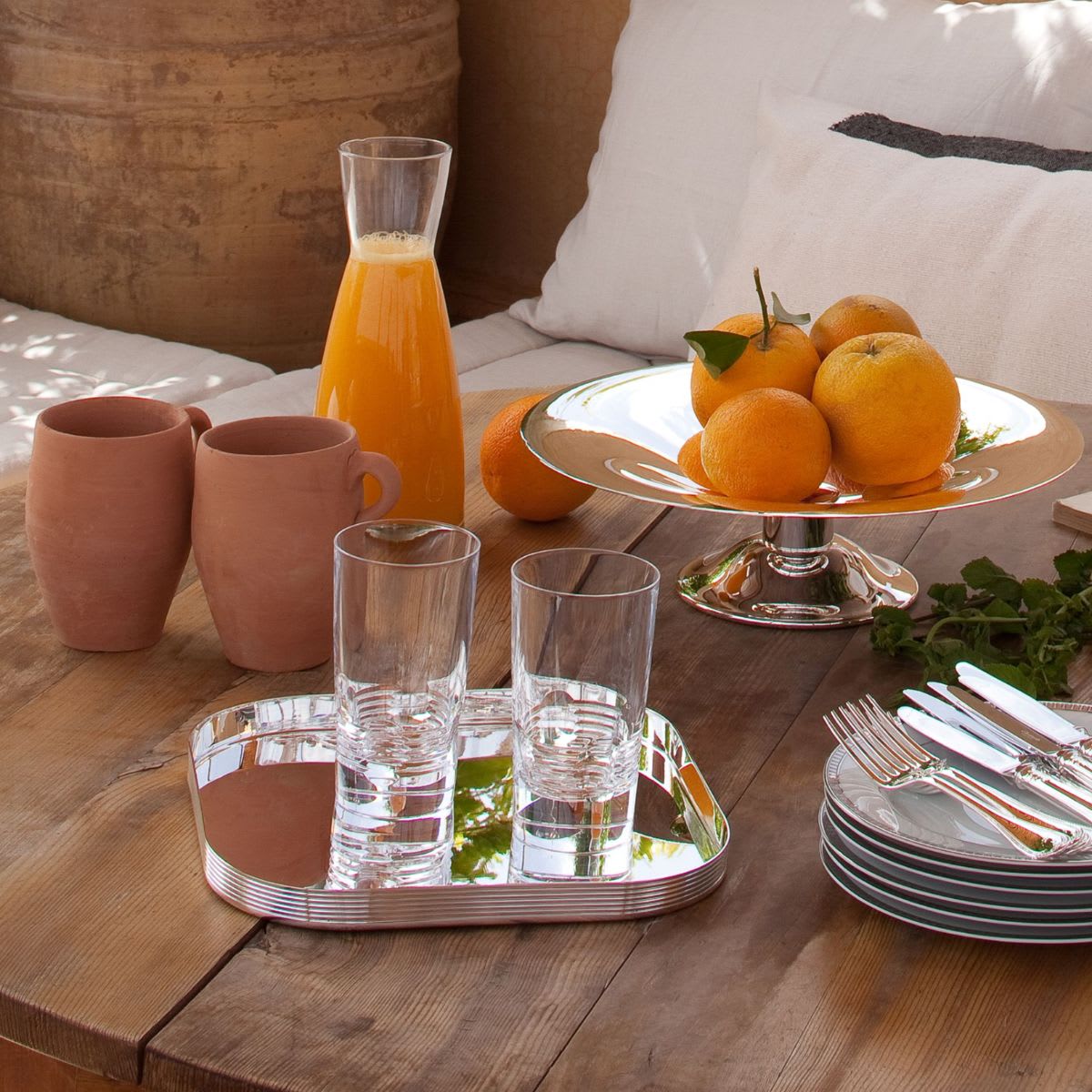 The K+T Collection includes several standout pieces such as the Silver-Plated Square Tray, Silver-Plated Bottle Coaster, Two Silver-Plated Coasters, Silver-Plated Two-Bottle Champagne Cooler Bucket, and the Silver-Plated Champagne & Ice Bucket Stand. Each item blends mirror-smooth and grooved edges for a striking look.