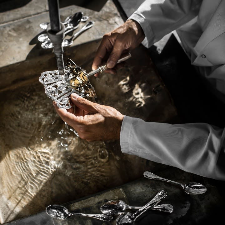 Maintaining the luster of sterling silver flatware involves regular care using Christofle’s specially formulated Silvercare range. Products like Flash Silver Cleaner, Silvercare Lotion, and Silvercare Cream are designed to clean, polish, and protect your silverware. Following the recommended methods of use will ensure that your flatware remains radiant and tarnish-free over time, reflecting Christofle's commitment to excellence in silver care.